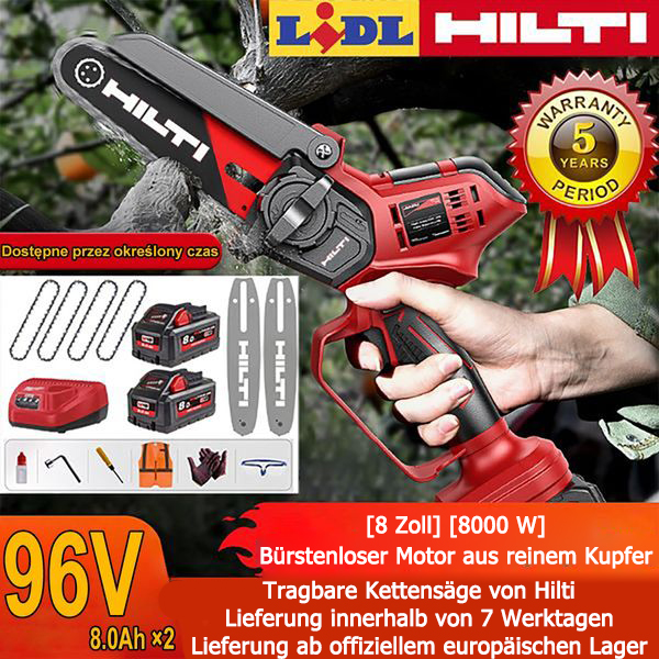8000-W-Lithium-Elektrosäge, 96-V-8,0-Ah-Akku*2, Ladegerät*2, Kette*4, Werkzeugkasten, Fett und Schutzbrille